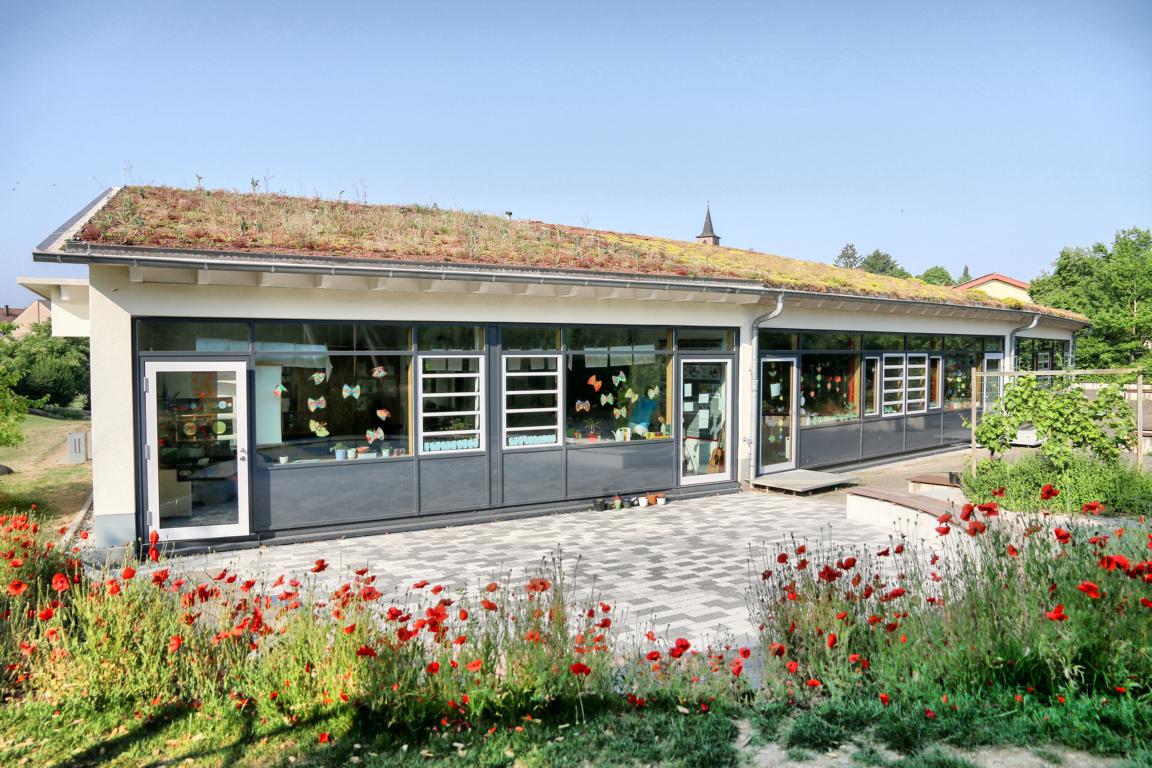 Im Schuljahr 2004/2005 wurde der Grundstein zu einer neuen Schule gelegt. Im April 2006 wurde das Gebäude, neben Dalberghalle und Kindergarten gelegen, fertig gestellt. Das alte Schulhaus, das 1881 errichtet wurde, wird von der Ortsgemeinde Essingen anderweitig verwendet. Der größtenteils „grüne“ Pausenhof erstreckt sich auf beiden Seiten um das Schulgebäude und bietet jede Menge Platz zum Rennen, Spielen, Toben und Kicken. Jedes Klassenzimmer hat direkten Zugang ins Freie und dort noch ein eigenes „offenes Klassenzimmer“, dessen halbkreisförmige Bank gerade in den Sommermonaten sehr gerne zum gemeinsamen Frühstück genutzt wird. Aber auch für kurze Bewegungspausen oder richtige Unterrichtsstunden sind diese Plätze sehr beliebt. Für den Sportunterricht wird die nahegelegene Dalberghalle genutzt.