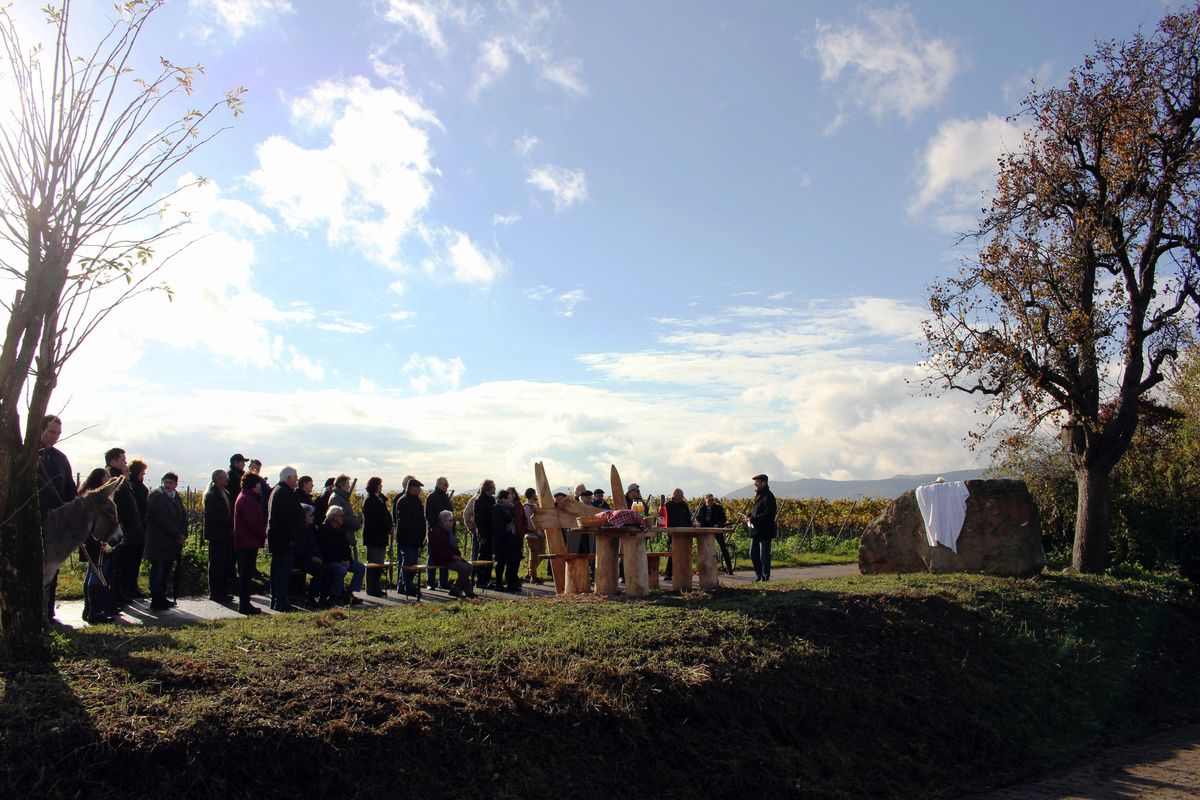 Die zum Verweilen einladende Sitzgruppe mit herrlichem Ausblick beispielsweise auf das Hambacher Schloss haben der ortsansässige Schreiner Bernd Marckert und sein Sohn Marius aus Kastanienholz gezimmert, das von Edith Atwater gespendet worden war. Die Firma Wintershall Landau hatte den mehrere Tonnen schweren Sandstein an seinen Platz gebracht. Ortsbürgermeister Dieter Ditsch sprach bei der kleinen Einweihungsfeier allen Beteiligten ein herzliches Dankeschön aus.